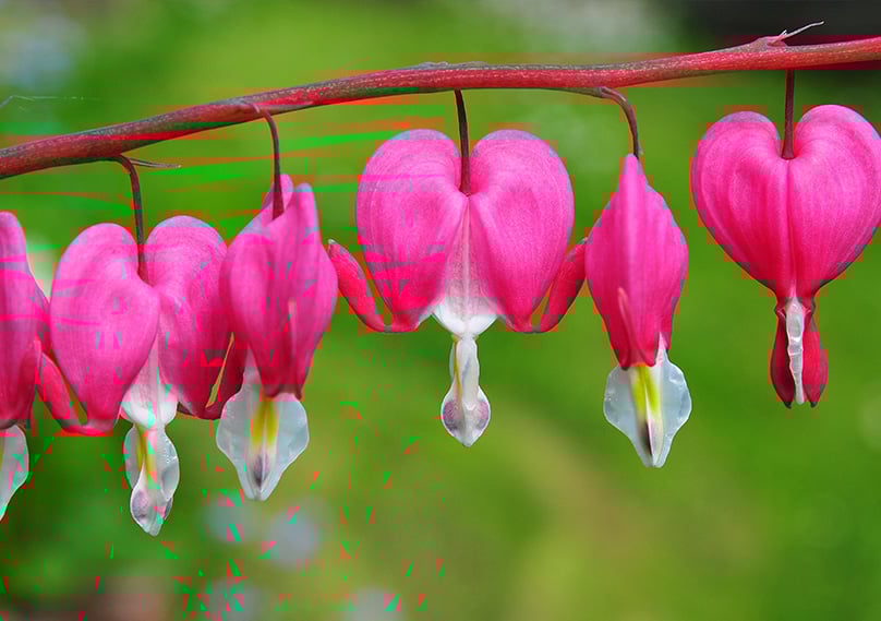 The flowers of the bleeding heart start to emerge in the early springtime, producing heart-shaped blooms sitting atop arching stems.