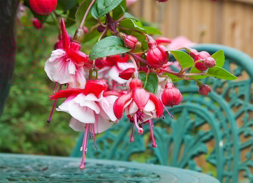 We like growing fuchsia in hanging baskets in shady areas of the yard, such as under the pergola or the patio awning.